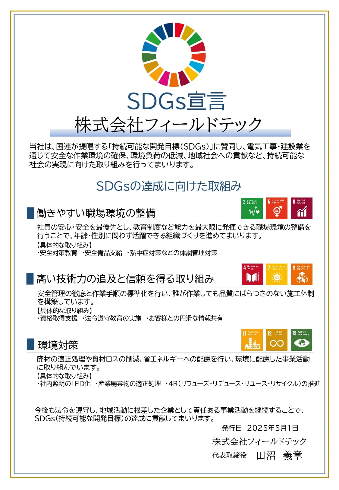 株式会社フィールドテックでは、事業活動を通じて持続可能な社会の実現に貢献するため、SDGsの趣旨に賛同し、宣言書を掲げています。